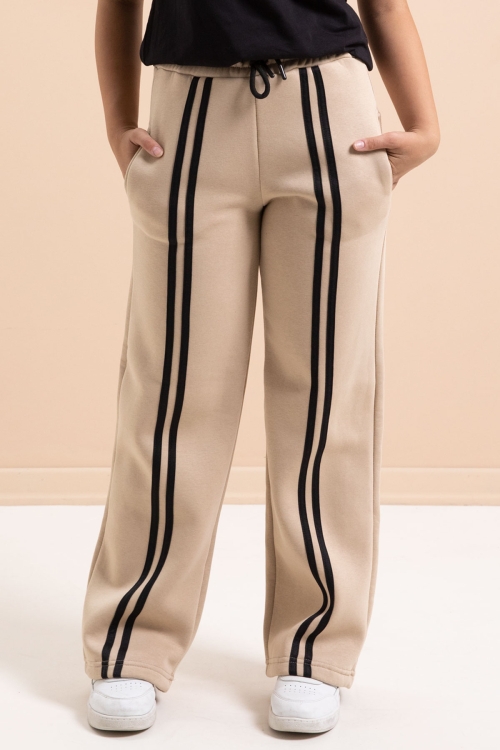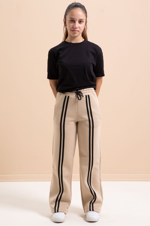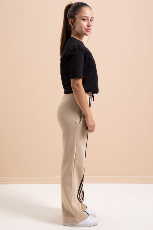 Bej Önü Şeritli Geniş Paça Şardonlu Kız Çocuk Basic Eşofman Altı 21276
