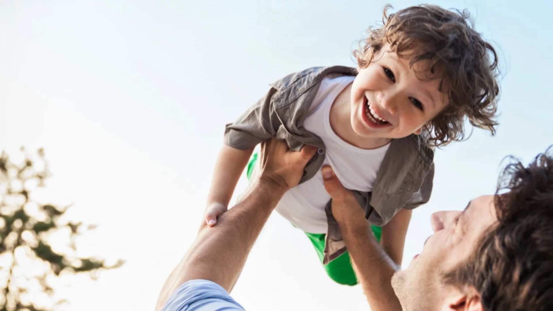 Baba: Koyu mavi gömlek, bej chino pantolon