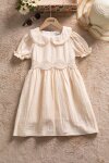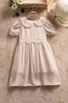 Kahverengi Dantel İşlemeli Kuşaklı Kız Çocuk Müslin Elbise 22660