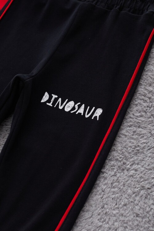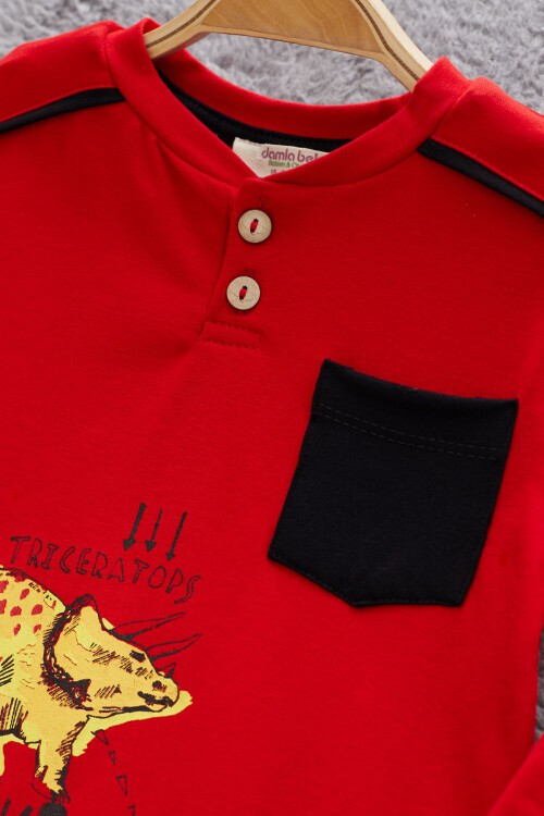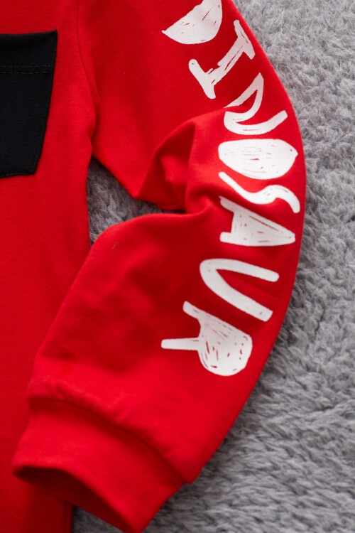 Kırmızı Dinozor Baskılı Cepli Erkek Bebek Eşofman Takımı