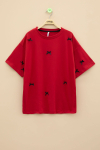 Kırmızı Fiyonk Nakışlı Kısa Kol Kız Çocuk Oversize Tişört 20799
