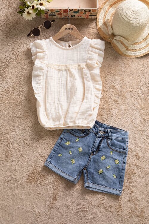 Kumaş İçeriği: %70 Pamuk %30 Polyester İçeriklidir. Çiçek Desenli Müslin Kumaş Uzun Kol Badi ve Şort Etek Kesim Salopetten Oluşan Kız Çocuk Elbise Takımı