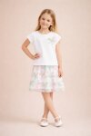 Kumaş İçeriği: %100 Pamuk İçeriklidir. Türkiye'de Üretilmiştir. Çiçek İşlemeli Tüllü Beli Lastikli Şık Etek ve Kısa Kol Tişörtten Oluşan Kız Çocuk 2li Etekli Takım Modeli.