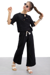 Siyah Boyundan Bağlamalı Kısa Kol Badi ve Beli Lastikli Geniş Paça Pantolondan Oluşan Kız Çocuk 2li Takım Modeli.