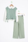 Örgü Desenli Süveter, Müslin Kumaş Uzun Kol Klasik Gömlek ve Geniş Paça Keten Pantolondan Oluşan Kız Çocuk 3lü Takım Modeli.