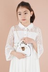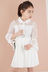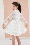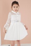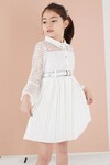 Beyaz Dantel İşlemeli Pileli Çanta ve Kemerli Kız Elbise 15109