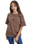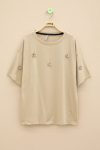 Ekru Gül Nakış Detaylı Kısa Kol Kız Çocuk Oversize Tişört 20809