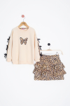 Kolları Fiyonk Detaylı, Kelebek İşlemeli Uzun Kol Sweatshirt ve Leopar Desenli Etekten Oluşan Kız Çocuk Takım Modeli.