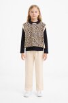 Krem Leopar Desenli Süveterli Badili Kız Çocuk Pantolonlu 3lü Takım 20665