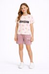 Lila Fiyonk Desenli Bisiklet Yaka Tişörtlü Kız Çocuk Şortlu Takım 23883