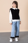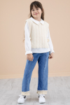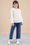 Kumaş İçeriği: %80 Pamuk %15 Polyester %5 Likra İçeriklidir. Şık Dantel Kumaştan Yandan Bağlamalı Süveter, Klasik Uzun Kol Bebe Yaka Gömlek ve Jean Pantolondan Oluşan Şık Kız Çocuk Takım Modeli.