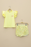 Pamuk İçerikli Kumaştan Üretilmiştir.  Çiçek Desen Bisiklet Yaka Kolları Fırfır Detaylı T-shirt ve Şort Etekten  Oluşan Kız Çocuk Takım Modeli.