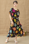 Siyah Çiçek Desenli Kısa Kol Kız Çocuk Kuşaklı Elbise