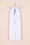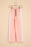 Kumaş İçeriği: %75 Pamuk %20 Polyester %5 Elastan İçeriklidir. Türkiye'de Üretilmiştir. Garnili Kumaş Detayı, Yazı Baskılı ve Geniş Paça Kesimi ile Beli Lastikli Kız Çocuk Eşofman Altı Modeli.