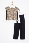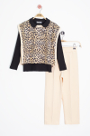 Taba Leopar Desenli Süveterli Badili Kız Çocuk Pantolonlu 3lü Takım