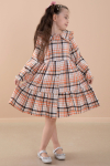 Turuncu Ekose Desenli Düğme Kapamalı Uzun Kol Kız Çocuk Elbise 20167